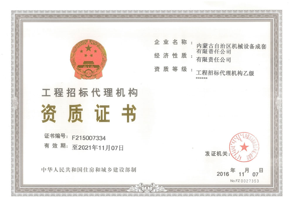 中央投資項目招標(biāo)代理機(jī)構(gòu)甲級資格證書